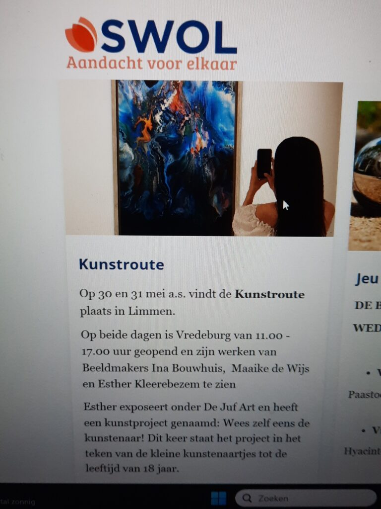 Na een leuke afspraak met de beheerders van SWOL in de Vredeburg, is daar een fijne samenwerking uit voortgekomen. Ze boden aan om reclame te maken voor de expositie en daarbij mijn oproepje voor mijn kunstproject Wees Zelf Eens de Kunstenaar. Ook op Facebook is er reclame gemaakt voor de expositie in de Vredeburg. Ik ben blij dat ik ze heb gesproken en zelfs een klapbord werd aangeboden om die te gebruiken tijdens het weekend van 30 en 31 mei. Dat zetten we buiten met een grote pijl en expositie erop.