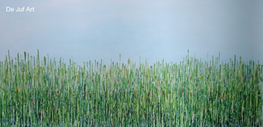 The Wave. Een doek van 40 bij 80 cm voorzien van een blank houten baklijst. Het is alsof u zelf in de zee staat bij het zien van dit schilderij. Gebruik gemaakt van de kwast en vloeibare acryl.